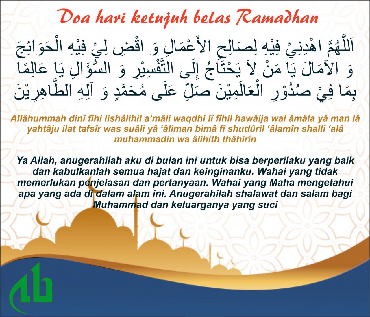 Doa Puasa Ramadhan Hari Ketujuh. Biasanya semakin bertambah hari semangat si Anak untuk berpuasa dan melakukan amalan-amalan lain sudah semakin menurun nih. Ramadhan Ketujuh Ini Doa Hari Ke 7 Puasa Ramadhan Lengkap Latin Arab dan Artinya Berikut bacaan doa selama Puasa Ramadhan 2021 yang dapat dibaca secara harian mulai dari 1 Ramadhan 1442 H hingga puasa hari terakhir.